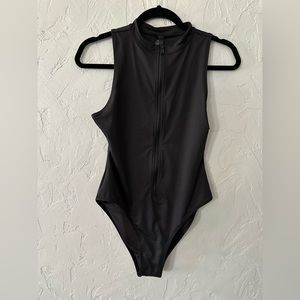 Sleek black one-piece swimsuit. Features a front zip closure. Sleeveless design. Perfect for a stylish swim.