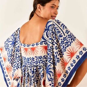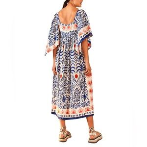 Elegant midi dress with vibrant blue and red patterns. Features a square neckline and flowing sleeves. Perfect for any occasion.