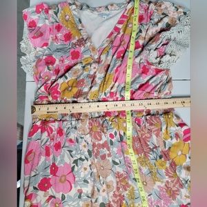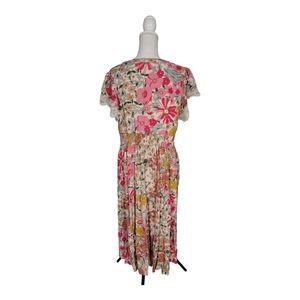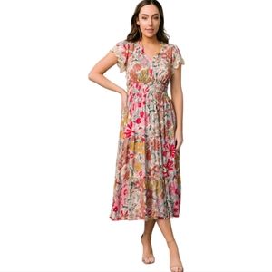 Reposhing this dress. Elegant floral dress with a mix of vibrant colors. Features a V-neck and short sleeves. Perfect for any occasion.