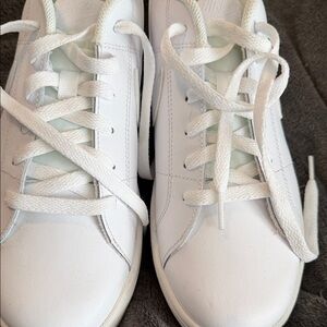Clean white women's sneakers with a low-profile silhouette. Smooth leather upper for easy care and a versatile look. Cushioned insole for everyday comfort and supportive fit. White laces and rubber sole complete the timeless design.