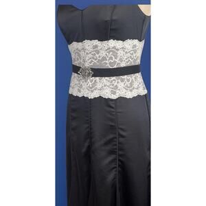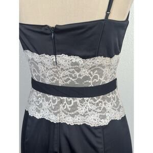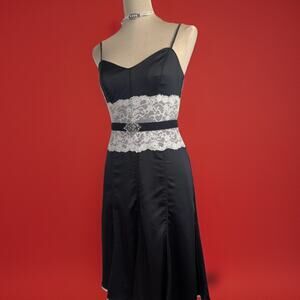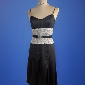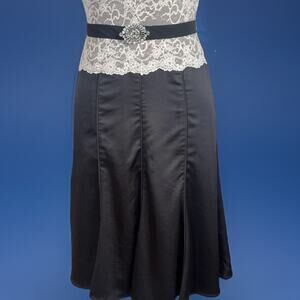 🖤 BCBGMAXAZRIA Black Satin Lace Cocktail Dress – Rhinestone Waist – Size S