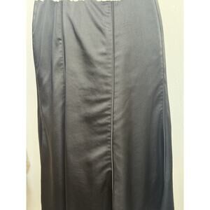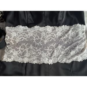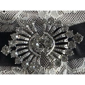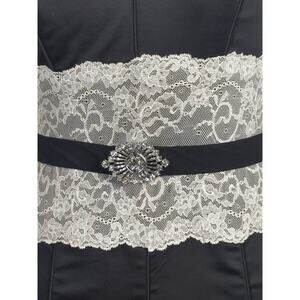 Sleek black satin with delicate spaghetti straps and a softly structured bodice that skims instead of squeezes. The waist is wrapped in ivory lace (romantic but dangerous) and cinched with a rhinestone brooch detail that catches light like a chandelier in a penthouse you absolutely did not pay for.