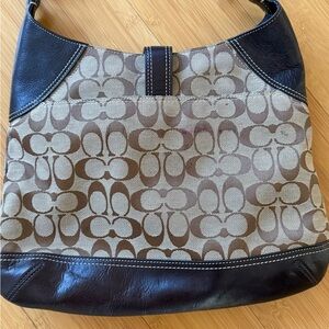 Classic Coach monogram canvas body. Dark leather trim and strap with contrast stitching. Silver-tone ring and clip hardware detail. Comfortable shoulder carry and structured hobo shape.