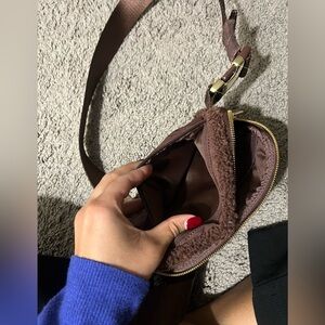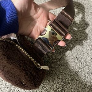 Stylish and cozy brown sherpa belt bag, perfect for on-the-go convenience.