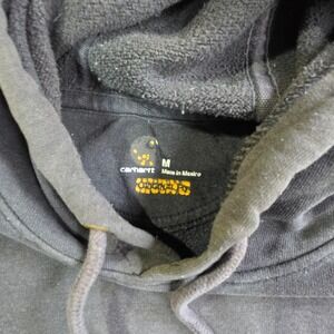 This vintage Carhartt Y2K hoodie features a black design with logo on sleeve and chest, size M, measures 23x29 inches, made in Mexico, pre-owned with wear.]