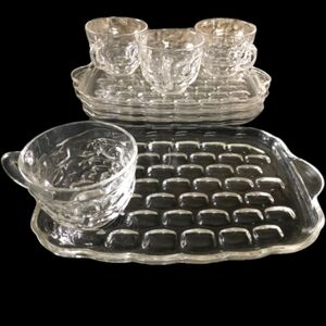 This vintage snack set from Federal Glass is a charming addition to any dinnerware collection. The set includes four plates and four cups, all made of clear glass and adorned with the Yorktown pattern. The set comes in its original boxed packaging, making it a great gift for any glassware enthusiast or vintage collector.