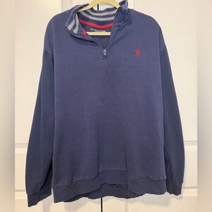 Excellent preowned condition. Classic U.S. Polo Assn. navy quarter-zip pullover sweatshirt featuring a red embroidered pony logo on the chest. Soft cotton blend with ribbed cuffs and hem and a sporty striped collar detail in navy and gray with a red accent trim inside the neckline. Comfortable relaxed fit that layers well for casual wear, athleisure outfits, or classic preppy style. Size 2XL.