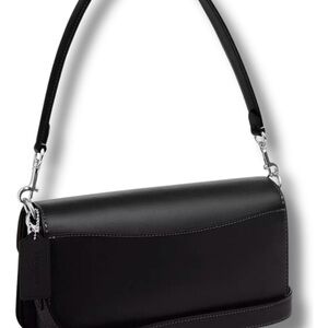 Compact black leather crossbody by Coach. Smooth leather exterior with a polished silver buckle. Flap top secures contents. Timeless, versatile design for everyday use.