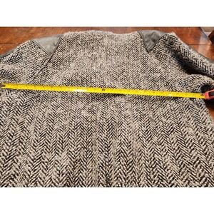 This is a walk back in time! There is no size on this but I am guessing it is either an XL or a XXL. There are built in shoulder pads, leather on the shoulders and under the collar. The pockets and buttons are hidden. The only damage I see is the bottom hem has come out and just needs restitched. Please review all of the photos to confirm condition.