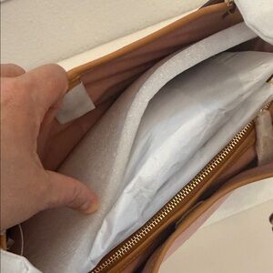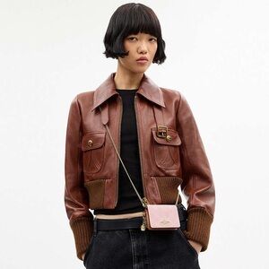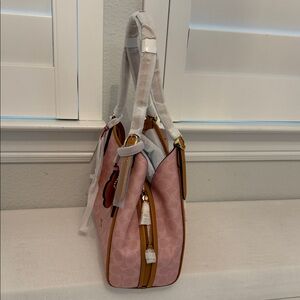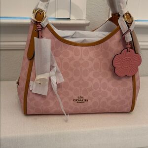 Chic Coach shoulder bag in pink and tan. Features elegant design with floral charm. Ideal for versatile styling.
