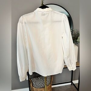 Effortlessly elegant and timeless, this beautiful Elie Tahari 100% cotton blouse brings refined femininity to any wardrobe. Crafted from crisp breathable cotton, this piece features delicate lace detailing along the collar and front placket, creating a soft romantic aesthetic that feels both classic and sophisticated.