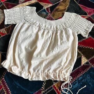 Vintage 60s/70s Gauzy Cotton Crochet Folk Peasant Blouse Drawstring Corset Cover Top