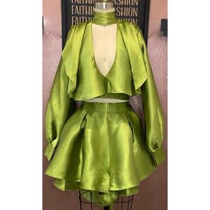 This elegant green satin skort set is perfect for any occasion. The luxurious fabric and vibrant color make it a standout piece in your wardrobe.