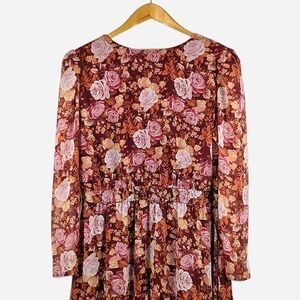 Brand new with tags — a gorgeous WAYF Roxanne midi dress that checks every box for the romantic, feminine wardrobe. Rich burgundy and rose floral print on a flowy chiffon-style fabric, with long mutton sleeves, structured shoulders, and a flattering surplice neckline with hidden snap closure. The tiered A-line skirt gives effortless movement and volume without feeling overdone.