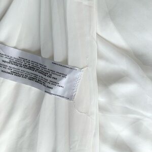 Offering textural contrast in a monochromatic palette, this versatile party dress in off white pairs a fitted crepe bodice with a softly gathered chiffon skirt. Slender straps and a plunging neckline highlight luminous skin, while a scalloped lace hem makes a romantic finish.