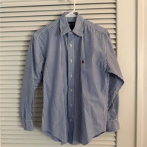 Classic button-down with navy and white stripes. Perfect for casual outings.