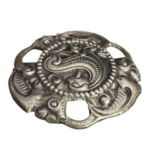 Vintage 1970s Viking-style brooch featuring a coiled dragon with bold raised detailing. Solid pewter-tone cast metal with cutout accents and strong texture. A striking mythic design with great weight and presence.