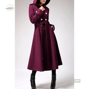 Long Wool Blend Trench Coat with Hood and Belts, Windproof Winter Coat