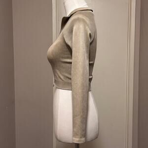 Mono B beige/tan ribbed, long-sleeved raglan sleeve crop top. Features a full zipper down the front and stand-up collar. It is made from a blend of polyamide and elastane and is moisture wicking. It is suitable for workouts or casual wear; it is comfortable and stretchy. Open to reasonable offers! Check my closet for more athletic wear both gently worn and NWTs.