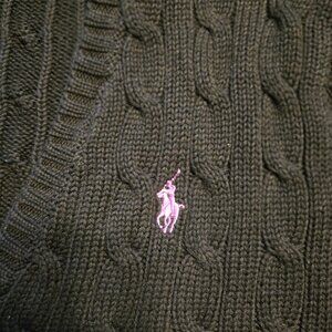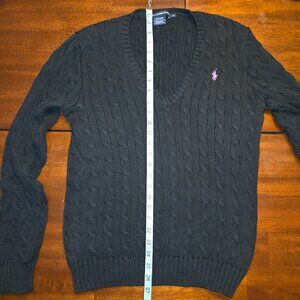 Ralph Lauren Sport Cable Knit V-Neck Sweater XL Black Cotton Purple Pony Classic
