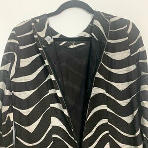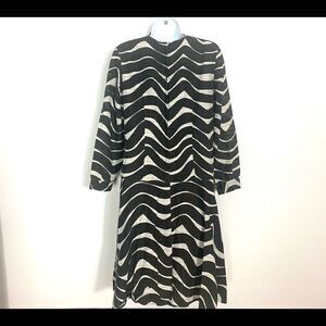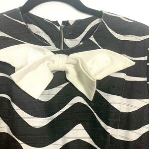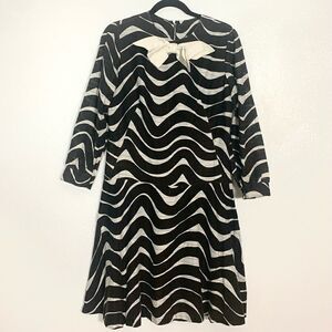 Simply fabulous! Super retro and cute. Bow at neckline attached inside w/ pins. Sewn in front. Back zip. A few spots (shown) Semi-sheer arms. Size tag 14. Approx measurements bust=19” waist=16” length from shoulder= 37” Perfect for a party w/ gogo boots! No fabric tag. Think it’s a poly blend. Fits size S-M best