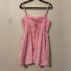 Charming pink mini dress. Features delicate floral pattern. Spaghetti straps. Perfect for casual outings.