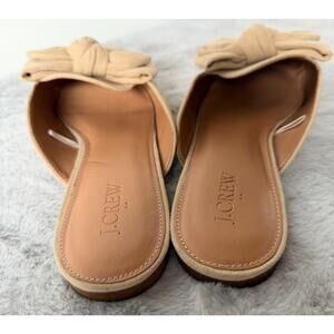 Stylish J.Crew bow mule flats in a versatile beige neutral tone. These slip-on shoes feature a pointed toe silhouette with an oversized bow detail across the vamp, creating an elegant and feminine look.