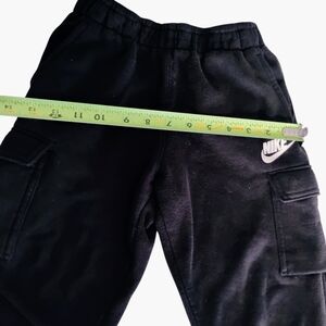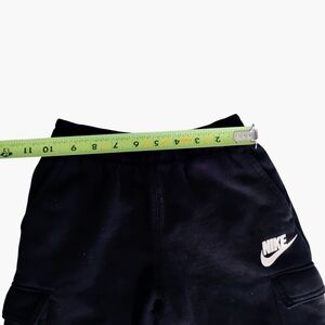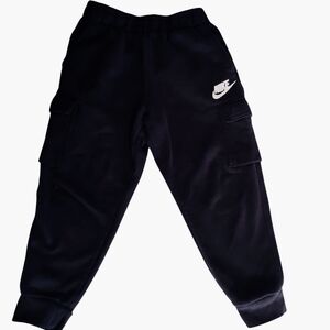 Comfortable black cargo sweatpants. Ideal for everyday wear. Super stylish and comfy black Nike cargo joggers for kids! Perfect for school, play, or everyday wear. Made with soft, cozy fabric that keeps them comfortable all day long. Features an elastic waistband for an easy fit, tapered legs with cuffed ankles, and multiple cargo pockets for that trendy streetwear look. Classic Nike Swoosh logo on the leg adds the perfect sporty touch.