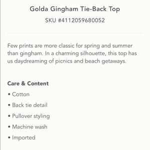 Anthropologie Porridge Golda Gingham Print Tie Back Top Turquoise NEW