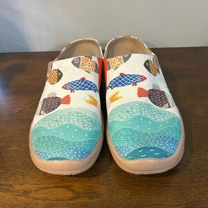 UIN Womens Happy Fish Shoes Size 10.5 White Blue Orange Slipper Mules Clogs Comfort MSRP $150