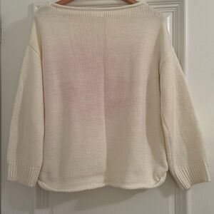 Stylish cream sweater featuring a bold pink heart. Ideal for casual outings. Cozy knit, cottage core, breezy sweater. Size small.