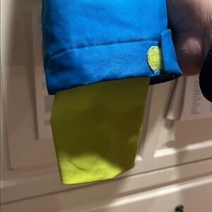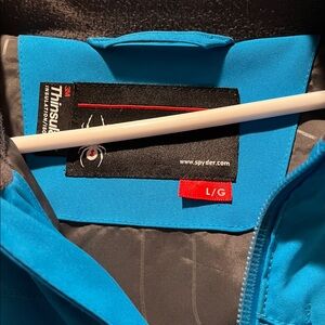 Experience warmth and style with this Spyder jacket. Perfect for skiing and snowboarding. Features a vibrant blue and charcoal design with yellow accents. This jacket is men’s size large. The hood is removable via zipper. Both side pockets has zipper. One of the wrists I believe has some spot stains and I took a pic of a spot stain at bottom of jacket at the start of the zipper. Other than that I think the jacket is in great shape. No major tears or anything like that. Pit to pit with jacket zippered is approx 20 inches and from top of shoulder to wrist is 27 inches. Multiple other pockets on jacket.
