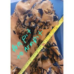 There's a tear on the inner wrap area (shown in pictures provided above) Measurements are provided in the pictures above. Please keep in mind this is a wrap dress so the measurements can vary since the wrap can be adjusted.