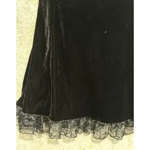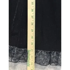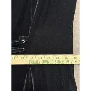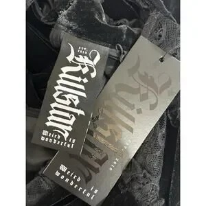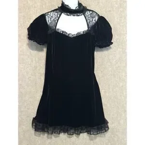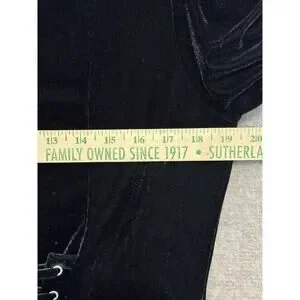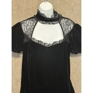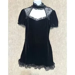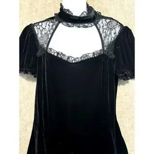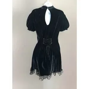 Killstar black velvet dress with corset pull-tie back. Lace. Cut out with double button back neck. Will fall above knee to knee length on most. Velvet. Stretchy. Machine wash. Size XL