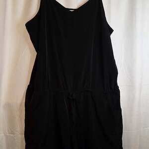 Effortlessly chic J.Crew Black Mini V-Neck Romper with delicate spaghetti straps. This versatile piece features a flattering V-neckline and an elasticated drawstring waist for a comfortable, adjustable fit. Perfect for warm-weather outings, it combines style and ease. Excellent pre-owned condition, no visible flaws. Size XL.