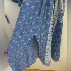 Elegant maxi dress caftan with intricate patterns. Features indigo and cream tones. Flowy silhouette with a bohemian vibe and slit in the front. One size fits most. Can probably fit up to a 1X