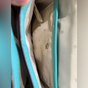 Excellent condition with no flaws inside or out. See pictures showing pristine condition. Soft turquoise color is not too bright; it’s like a beautiful aquamarine color. All leather. Measurements in photos. White dust bag included. Great gift!