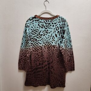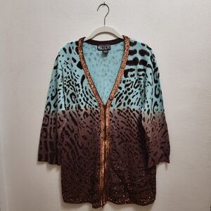 VTG Berek Leopard Print Zip Cardigan Sweater Brown Turquoise Ombre Sequins READ