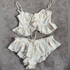 Chic cream lace bralette with delicate ruffles. Matching shorts for a stylish set. Ideal for lounging. New condition never worn!