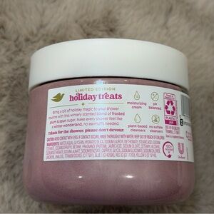 Indulge in the luxurious Frosted Plum Berry Body Scrub. This limited edition scrub features a delightful pink hue, perfect for revitalizing your skin.