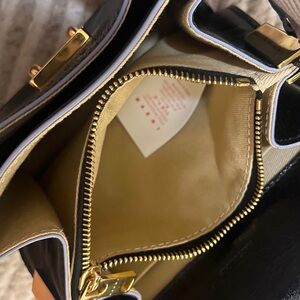 Stunning authentic Marni mini trunk bag in black soft leather with blue trim and gold hardware. Excellent used condition. Made in Italy. No noticeable flaws except for minor scratches on hardware on underside of flap (pictured). The light blue trim and supple black leather helps this bag transition seamlessly from day to night. 6.5 x 3.5 x 5. Comes with original dust bag.