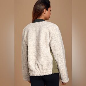 Keep warm & stay on-trend in the Free People Rivington Olive Green and Ivory Sherpa Jacket! Cozy ivory sherpa creates this essential jacket with a contrasting olive green accents. Relaxed, oversized bodice with diagonal front pockets & elastic at back for fit.