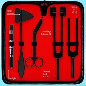 5 piece diagnostic kit that includes carrying case, penlight, Taylor hammer, bandage scissors, and tuning forks.