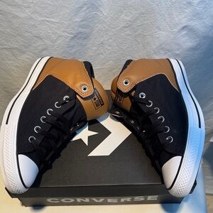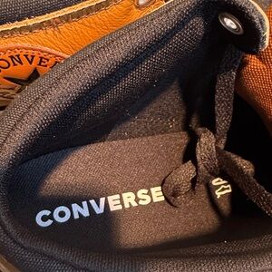 Classic Converse sneakers with a black canvas body and brown accents. Iconic design with durable construction. Ideal for everyday wear.