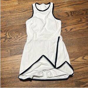 Elegant white sleeveless dress featuring a stylish black trim. Perfect for any occasion.