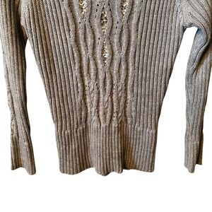 ROZ & ALI sweater with a shimmering metallic thread woven. This top features a flattering cowl neckline and intricate cable knit detailing down the front, accented with subtle sequin embellishments for a touch of sparkle. The ribbed texture and fitted silhouette make it a versatile piece for various occasions. Perfect for a sophisticated dinner out or a festive holiday gathering.