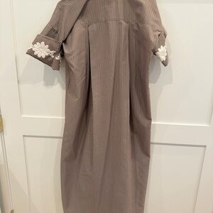 Elegant brown striped maxi dress. Features white floral embroidery on sleeves and neckline. Perfect for casual or formal occasions.