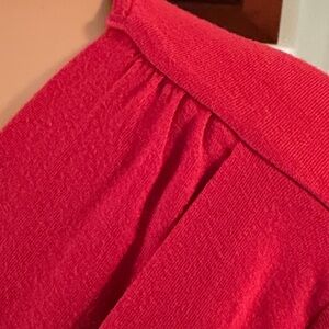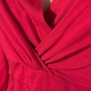 Soft red surplice V-neck top with a flattering twist-front and fitted waist. Lightweight, stretch fabric for comfortable all-day wear. Elegant long sleeves and a versatile silhouette for casual or dressed-up looks. Red color adds a vibrant, polished touch.