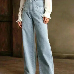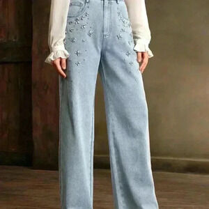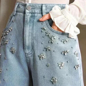 Light Wash Casual Women's Hand-Stitched Rhinestone Jeans