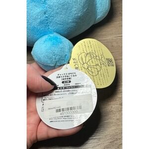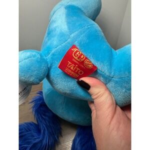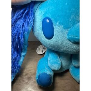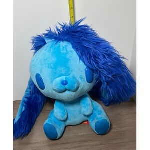 A vibrant blue plush toy depicting a fluffy bunny rabbit with long, shaggy ears and a cute, expressive face. This adorable character, reminiscent of the Gloomy Bear aesthetic, sits upright with its paws resting in its lap. The plush features a bright blue body with darker blue accents on its nose and feet. Attached are official tags, indicating it's a collectible item. This plush would be a perfect addition to a kawaii collection, a delightful companion for a child's room, or a unique accent piece for a themed display.